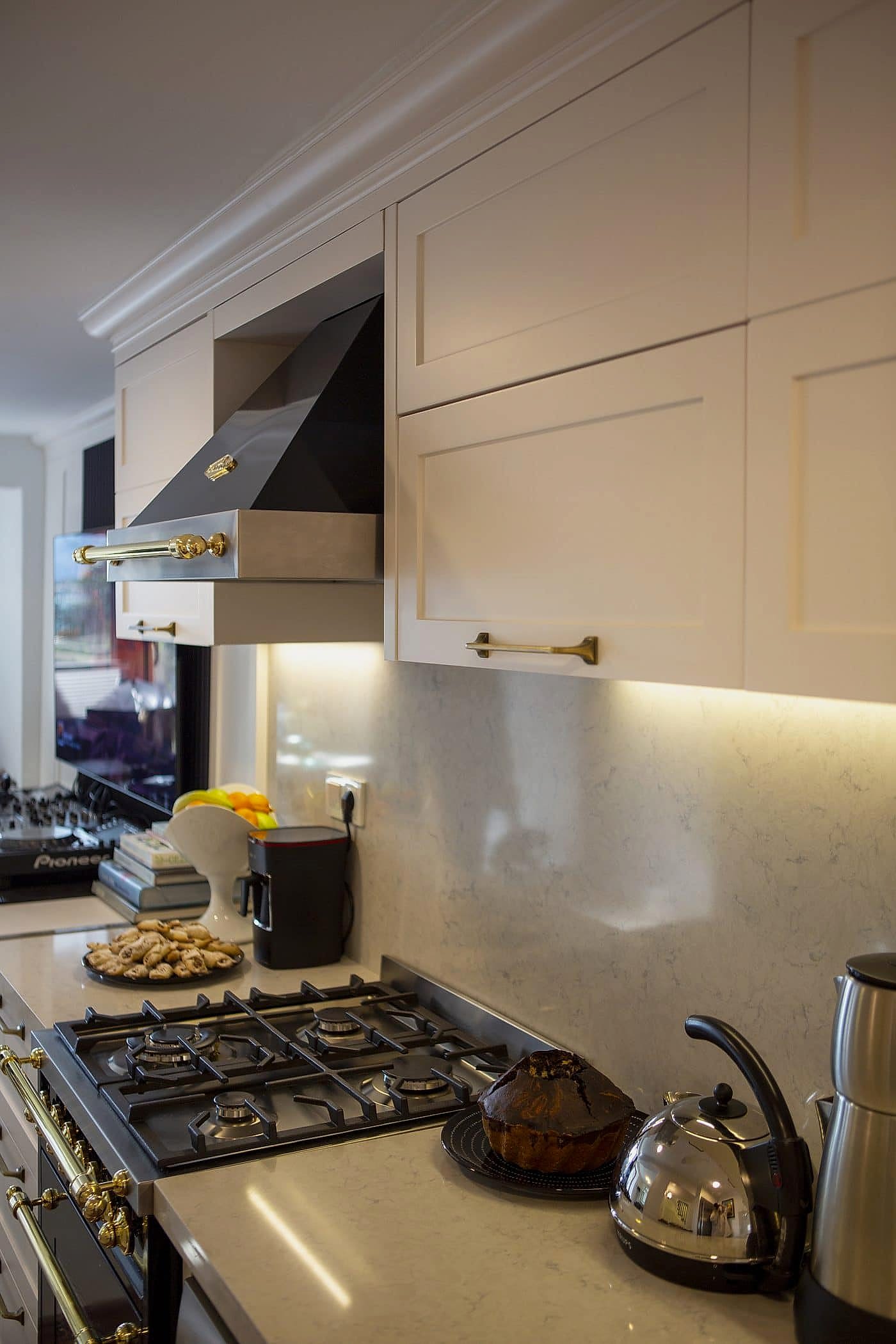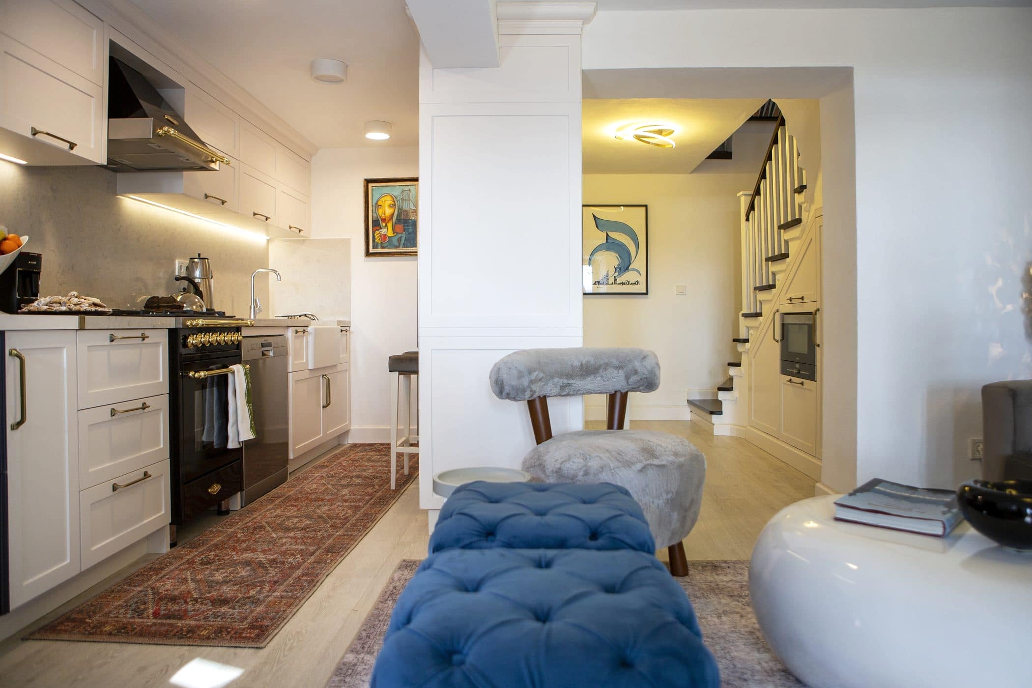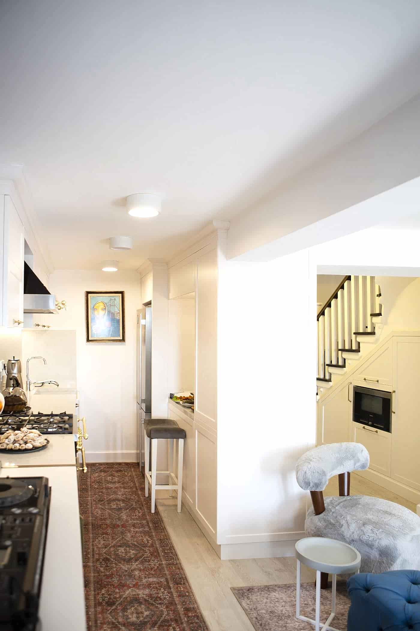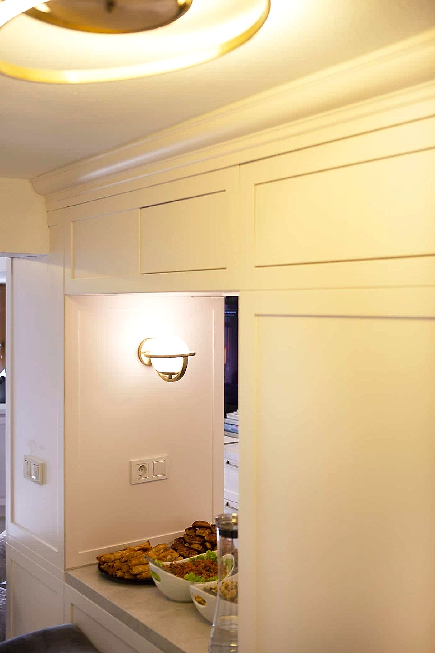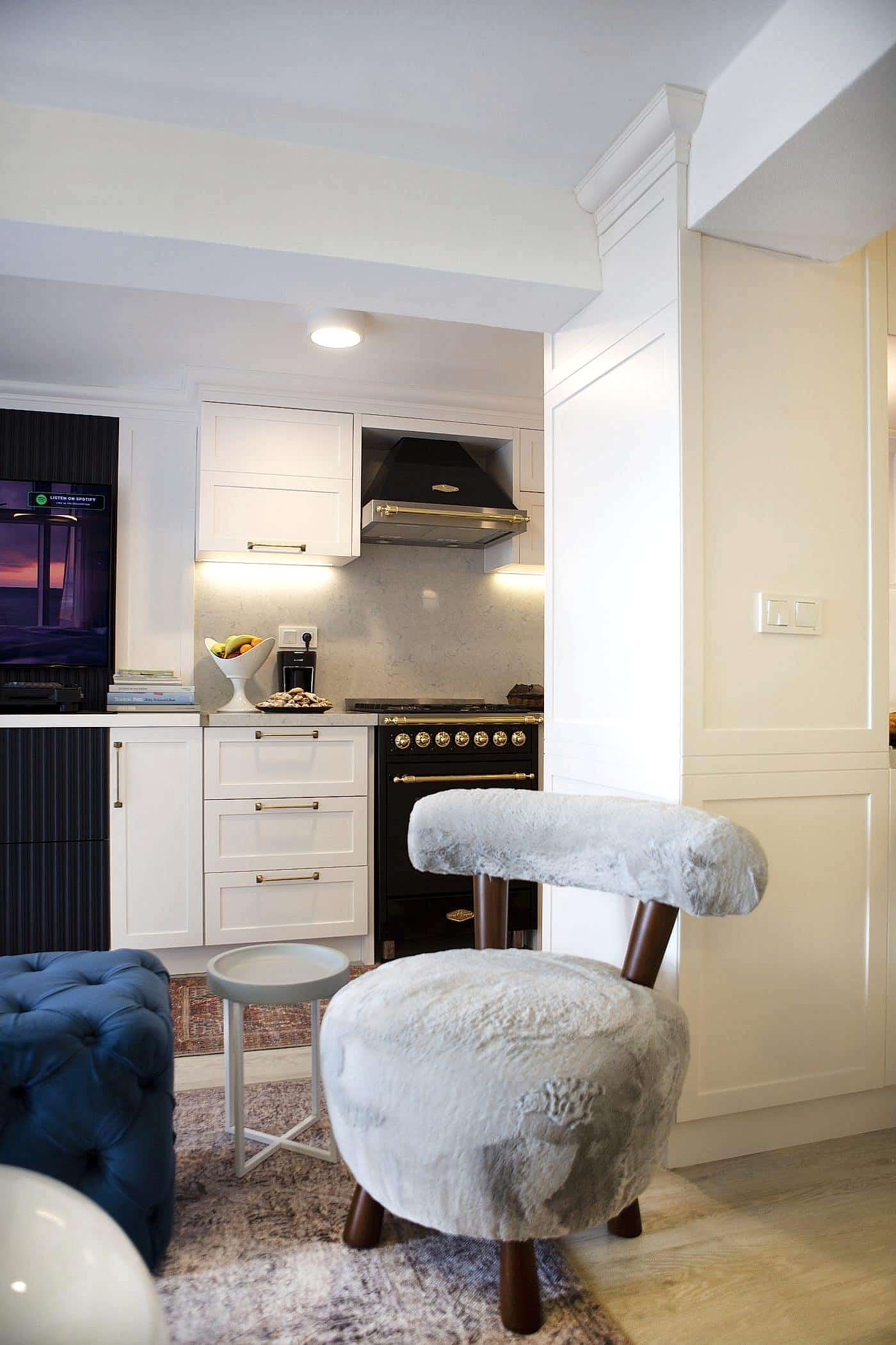 Güzel bir manzaraya sahip evin ışığını maksimum verim ile mekana yansıtmak amacıyla beyaz ahşapların yanında, tv alanını özelleştirdiğimiz antrasit pano ile mekana soluk getirildi. Öykü Hanım’ın zevkli mobilyaları ile tamamlanan projemiz bizim için keyifli bir tasarım ve uygulama süreci oldu.